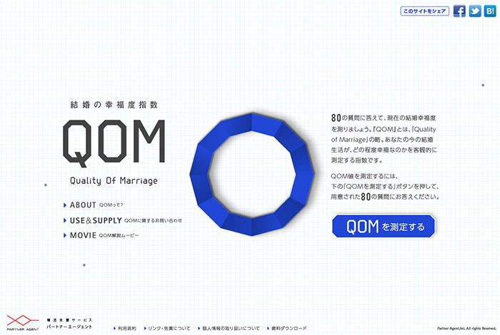 The “Quality of Marriage” index, or QOM, was developed as a way to challenge the belief that every marriage is the same, and to objectively quantify the amount and quality of happiness in a marriage. Developed jointly by dating site Partner Agent and Hakuhodo’s R&D department, the project was revealed on November 22nd, 2013, also known as “Happy Couples Day” in Japan. Over 100,000 users took the QOM test.