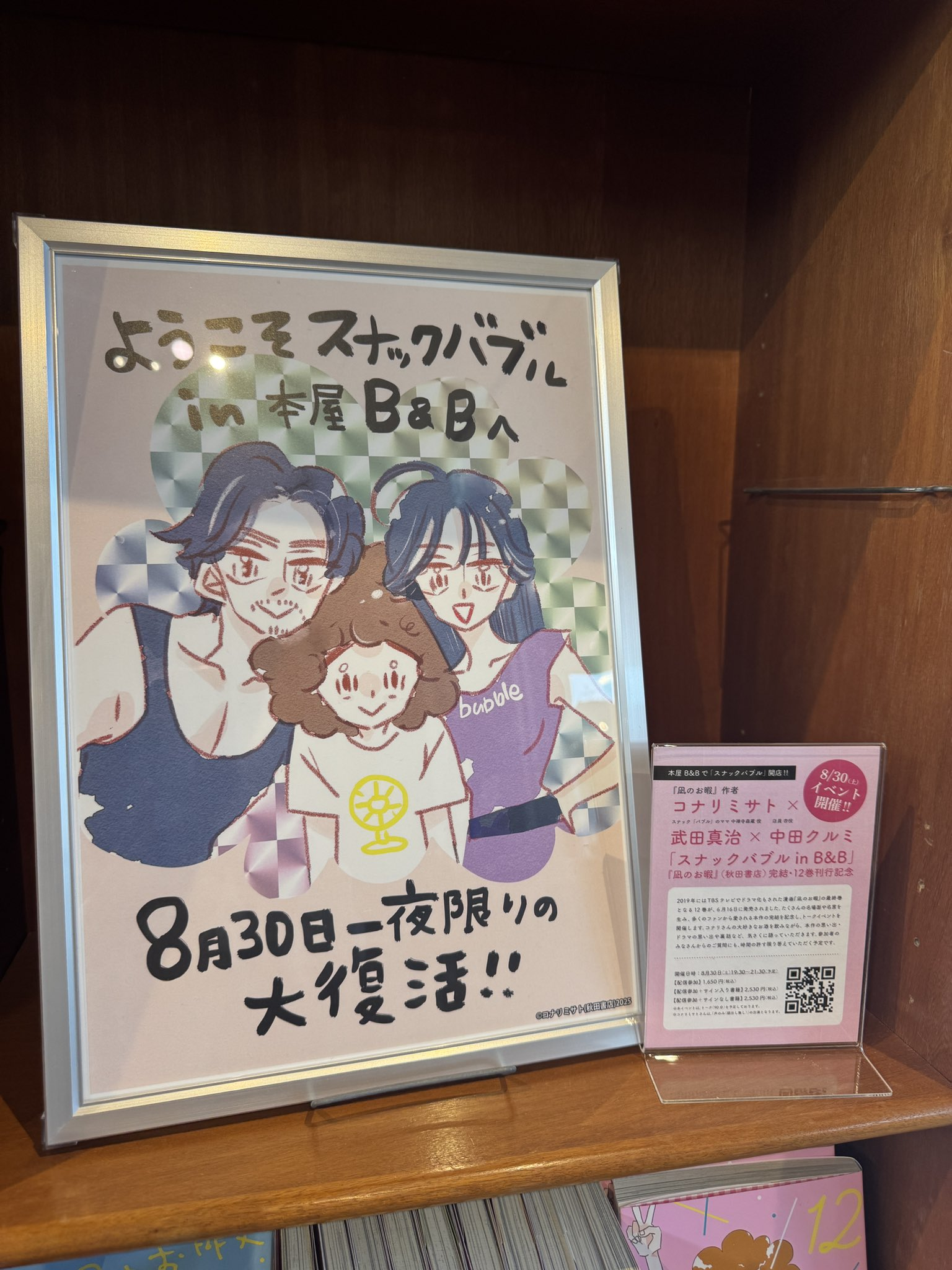 今月末に、本屋B&Bにて、コナリミサトさんの漫画『凪のお暇』にでてくるスナック「バブル」が一日限りの復活を遂げることを記念して、本屋B&Bでコナリミサトフェアを開催中。